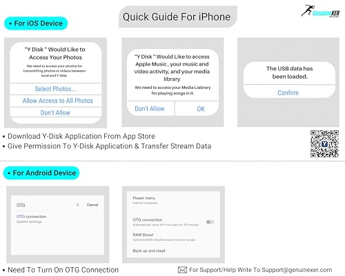 ☑ Important: This 4 in 1 flash drive is compatible with ios 8 and above. Please note that to use it with an iphone, you need to download the Y-Disk app from the App Store. For Android devices, ensure the OTG function is enabled in the settings to transfer or stream files seamlessly.