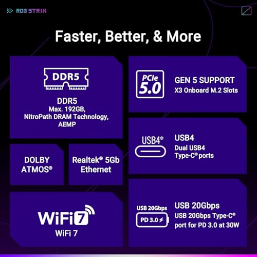 Ready for Advanced AI PCs: Designed for the future of AI computing, with the power and connectivity needed for demanding AI applications AMD AM5 Socket: Ready for AMD Ryzen 9000, 8000 and 7000 series desktop processors  Intelligent Control: ASUS-exclusive AI Overclocking, AI Cooling II, AI Networking II and AEMP to simplify setup and improve performance  ROG Strix Overclocking technologies: Dynamic OC Switcher, Core Flex, Asynchronous Clock and PBO Enhancement   Robust Power Solution: 18+2+2 power solution rated for 110A per stage with dual ProCool II power connectors, high-quality alloy chokes and durable capacitors to support multi-core processors  Optimized Thermal Design: Massive heatsinks with integrated I/O cover, high-conductivity thermal pads, and connected with an L-shaped heatpipe  Latest M.2 Support: Three onboard PCIe 5.0 M.2 slots, and two PCIe 4.0 M.2 slots, all with substantial cooling solutions  ​ Abundant Connectivity: Dual USB4 Type-C ports, USB 20Gbps Type-C rear I/O port with PD 3.0 up to 30W and USB Wattage Watcher, ten additional USB 10Gbps ports, PCIe 5.0 x16 SafeSlots, HDMI port