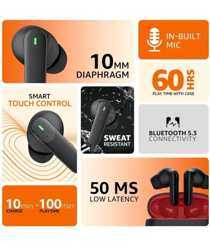 Uninterrupted Playback: Enjoy up to 60 hours of non-stop music, podcasts, or calls with the long-lasting battery life of these earbuds.