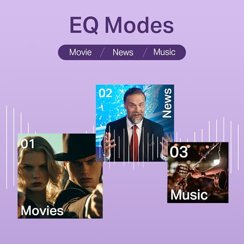 EQ Modes: Movies, Music, News & 3D – a mode for each mood! Now visuals seem larger-than-life and music engages you completely when accompanied by thumping audio.