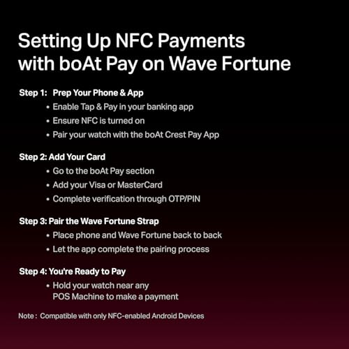 The all-new boAt Wave Fortune is a feature-packed smartwatch designed to elevate your everyday experiences. With NFC Tap & Pay functionality, seamless transactions are just a tap away, while the vibrant 1.96” HD Display ensures clear visibility and intuitive navigation. Enjoy crystal-clear Advanced Bluetooth Calling and stay connected effortlessly. Dive into fitness with over 100 sports modes and specialized Female Wellness tracking. Engage with the AI Voice Assistant for hands-free convenience and customize your watch face with ease. Take control of your music and camera directly from your wrist. Built to withstand the elements, the Wave Fortune boasts IP68 Dust, Sweat & Splash Resistance, making it suitable for any adventure. Plus, keep a constant eye on your health with integrated Heart Rate and Blood Oxygen Monitoring. With the boAt Wave Fortune, stay ahead, stay connected, and stay active.