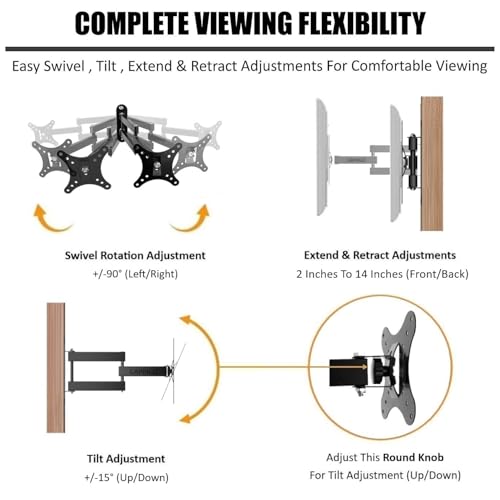 Complete Viewing Flexibility : Six Way Full Motion Adjustable TV/Monitor Mount Having The Following Specifications – Tilt : +/- 15° (Up / Down) | Swivel Rotation : +/- 90° (Left / Right) | Maximum Distance From Wall When Extended : 14 inch | Minimum Distance From Wall When Retracted : 2 inch