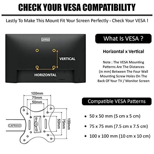 Vesa Compatibility : 50 x 50 mm (5 cm x 5 cm), 75 x 75 mm (7.5 cm x 7.5 cm) And 100 x 100 mm (10 x 10 cm). Vesa Is The Distance Between The Four Wall Mounting Screw Holes On The Back Of Your TV/Monitor Screens.