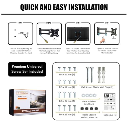 Caprigo Premium Series Heavy Duty TV & Monitor Wall Mount Stand Built With A Solid Thick Gauge Of Superior Cold Rolled SteelRugged & Robust Metal Construction Offering A Superior & Safe Wall Mounting SolutionBuilt By A Team Of Wall Mounting Experts At Caprigo, Making It Durable With A Long Lasting PerformanceSturdy & Strong Metal Wall Mount Bracket With Increased Thickness To Hold The Weight Of You’re Premium TV’s & Monitors Effortlessly