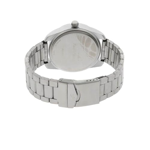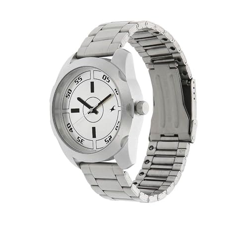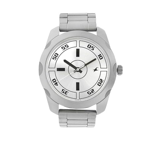 Sport a confident and edgy vibe with the Fastrack Watch. The silver dial features bold black numeric minute markings around the perimeter, lending a sporty, high-contrast aesthetic. Its industrial-style layout is complemented by a full silver-tone stainless steel strap and case for a strong wrist presence. Sleek black hands and a unique circular design at the center add a modern twist, making it the perfect everyday companion for bold self-expression.