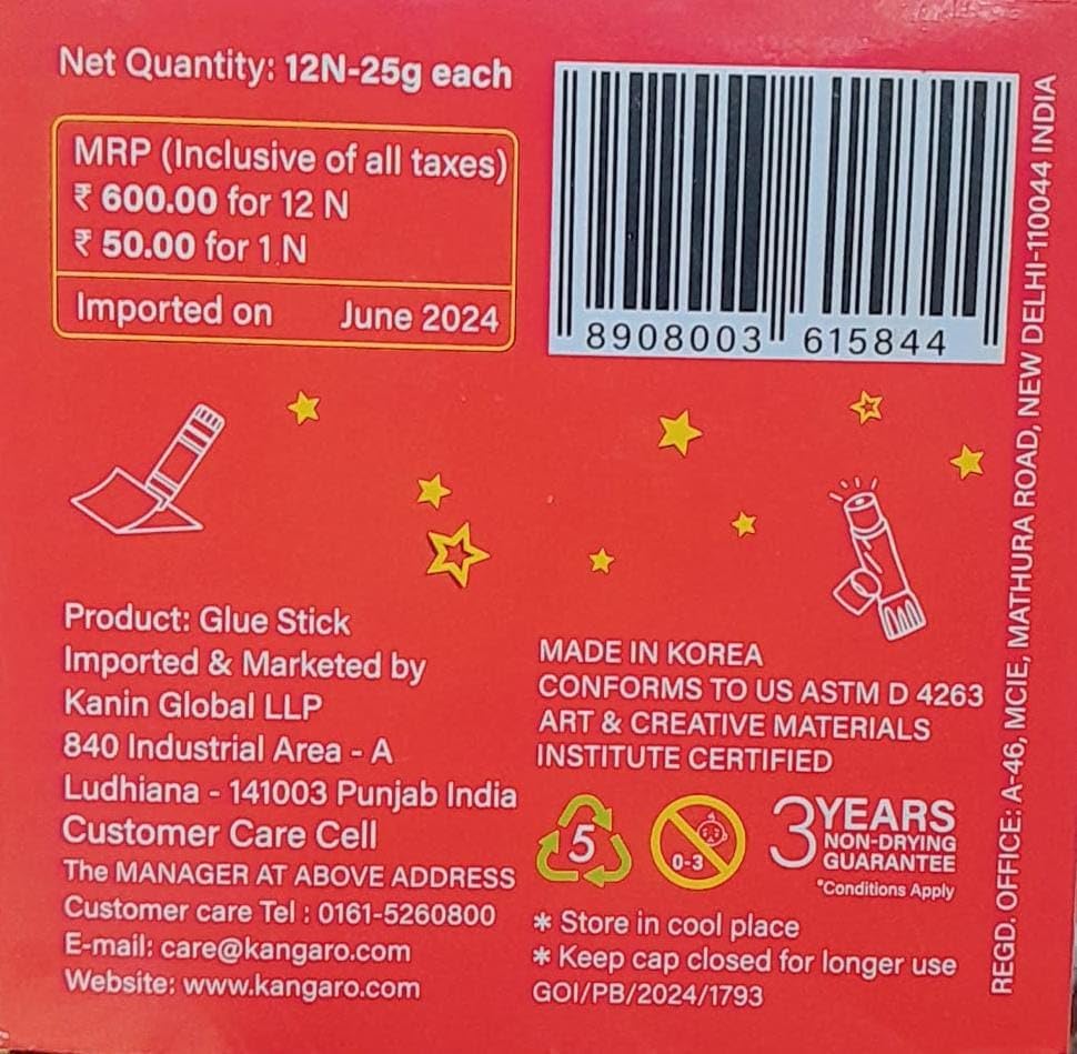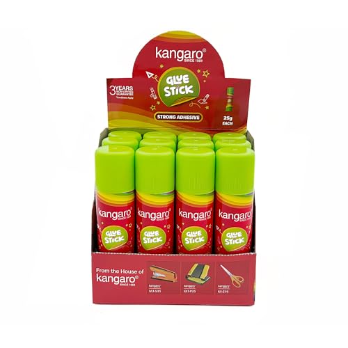 kangaro Glue Stick, 25g, Pack of 12, clear adhesive, with each stick weighing 25g, is suitable for a variety of tasks at home, school, and the office
