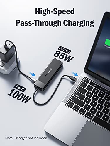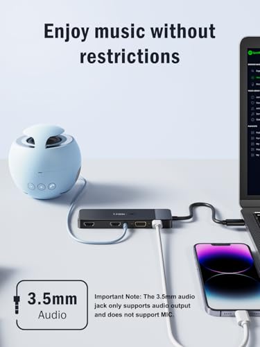 【100W PD Charging + 3.5mm Audio Jack】The USB-C PD port supports the PD 3.0 protocol, delivering fast charging up to 85W (with 15W reserved for the hub’s operation). ⚠⚠⚠Note: The Type-C port is for power input only and cannot be used for data output or display output.Dell laptops may show a slow charging issue,Using a higher-power charging adapter can fix this problem. The built-in 3.5mm audio jack lets you connect headphones or speakers seamlessly, enjoying immersive sound during movies, music, or video calls