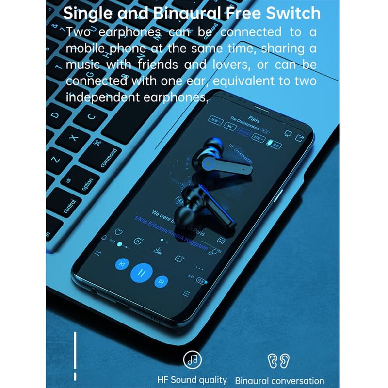 intelligent 3D Touch: The wireless earbuds have a built-in high-sensitivity touchpanel and gently touches intelligent recognition Your intention is to complete a variety of operations quickly. Strong Bass: Our wireless earbuds with HiFi sound quality. Dynamic unit design good audio analysis, undistorted details, excel-lent listening experience. intelligent 3D Touch: The wireless earbuds have a built-in high-sensitivity touchpanel and gently touches intelligent recognition Your intention is to complete a variety of operations quickly. Large Capacity Charging Cabin: 5.0 Low power consumption is the core technology of headphones, adoptMinienergygather-ing cabin design, Sensitive metal contact, which can be put and charged immediately, Protect your wireless music. Bluetooth 5.1 Powerful Performance: Compared with the old version of Bluetooth 5.0,thetrans-mission distance is greatly improved Signal stability and an-ti interference ability are enhanced Standby power consumption is reduced.