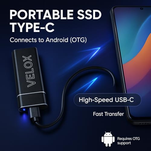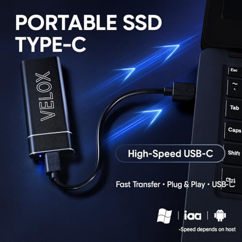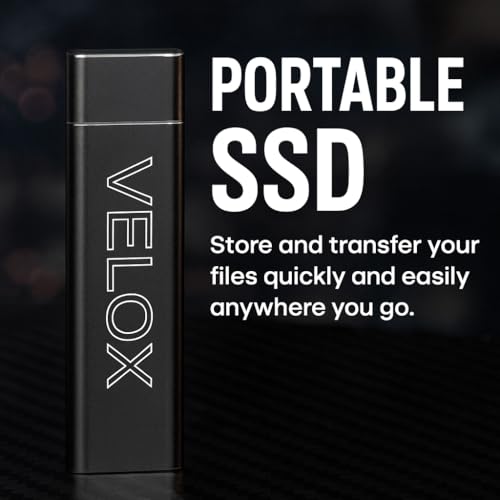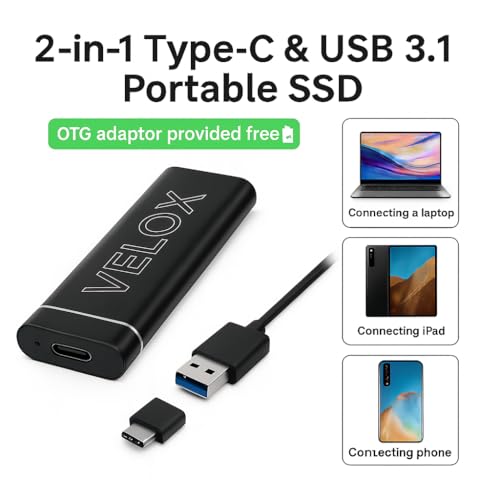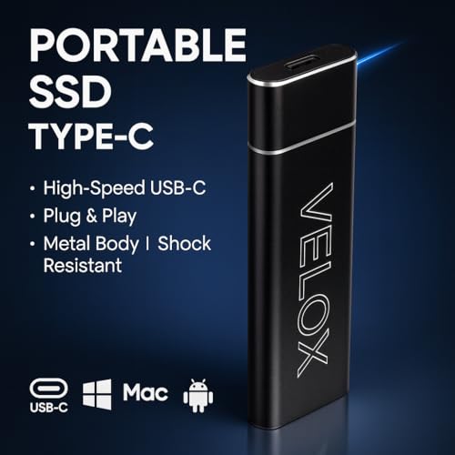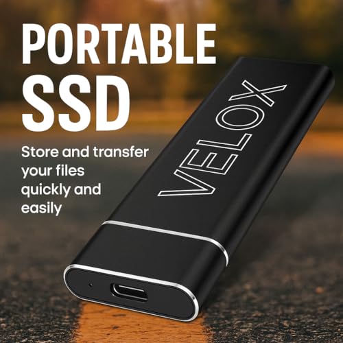 Introducing the VELOX Portable SSD, a premium storage solution that combines speed, durability, and versatility. This sleek drive features USB 3.1 Gen 2 technology, delivering blazing-fast transfer speeds up to 10Gbps for your photos, 4K videos, and large projects. The sophisticated anodised aluminium shell measures just 10cm × 3cm, making it perfectly pocket-sized while providing excellent shock resistance and thermal management. Compatible with multiple platforms, it works seamlessly with laptops, Macs, Android devices, and iPads through its USB-C interface. The package includes both a USB-A 3.1 cable and a Type-C OTG adaptor for maximum connectivity flexibility. Built for professionals, creators, and gamers who demand reliable high-speed storage on the go, this drive offers plug-and-play functionality across devices. The premium build quality is backed by a comprehensive 4-year warranty, ensuring long-term peace of mind. Whether you’re storing important work files, editing media projects, or expanding your gaming library, the VELOX Portable SSD delivers exceptional performance in a sophisticated, travel-ready package.