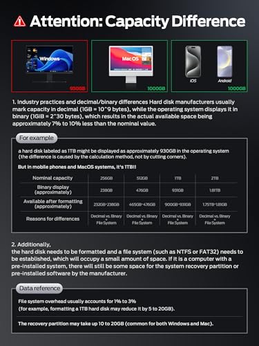 【Attention】–The 256GB hard drive you purchased is calculated by the manufacturer in decimal (1TB=1000GB), but the computer displays it in binary (1TB≈1024GB), so the system will show approximately 238GB. In addition, formatting will occupy a small amount of space, and the final available capacity is approximately between 232GB and 238GB. This is a normal phenomenon for all hard disks and not a quality issue. The same is true of international brands.