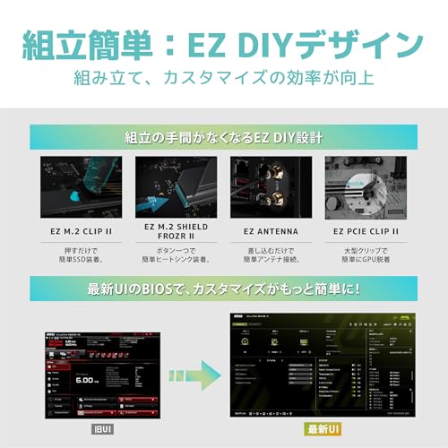 DOUBLE M.2 CONNECTORS – Storage options include 1 x M.2 Gen5 x4 128Gbps slot and 1 x M.2 Gen4 x4 64Gbps slot; Features EZ M.2 Shield Frozr II to prevent thermal throttling and EZ M.2 Clip II for EZ DIY experience