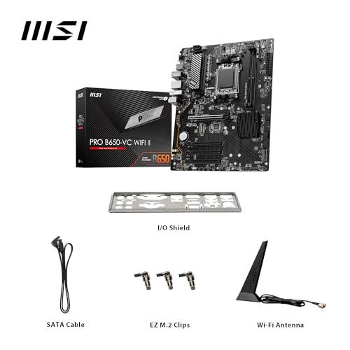 PRO B650-VC WIFI II: Business Elegance Designed for value-oriented creative businesses on the AMD B650 chipset (Ryzen 7000 series supported, AM5), the MSI PRO B650-VC WIFI II motherboard includes a primary PCIe 4.0 x16 graphics card slot (with Steel Armor), the latest DDR5 memory module support (7800+MHz/OC), and triple M.2 Gen4 storage options. To ensure reliable power delivery to AMD Ryzen 7000 Series desktop processors, the MSI PRO B650-VC WIFI II features a fully digital power design VRM platform with Core Boost, augmented with passive & active – Frozr AI – cooling. MSI B650 pro motherboards feature durable PCBs with 2oz of thickened copper and PCIe Steel Armor to support the primary graphics card slot. Connectivity includes the latest Wi-Fi and Bluetooth 5.3 technology, 1G LAN , USB 3.2 Gen 2 Type-A (10Gbps), 4K/60Hz display support, and 7.1 HD audio. For professionals looking for an efficient Ryzen 7000 series motherboard with high-bandwidth PCIe 4.0 x16 graphics card architecture, improved DDR5 memory support, and triple M.2 Gen4 storage options, the MSI PRO B650-VC WIFI II epitomizes business elegance.