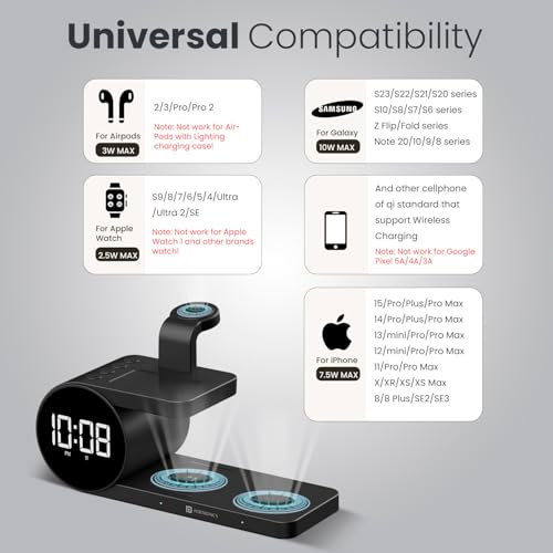 5-in-1 Wireless Charger Station: Charge up to 3 devices simultaneously—smartphones, smartwatches, and earbuds. With 15W for phones, 5W for earbuds, and 2.5W for watches. Works with iPhone, Samsung, Apple Watch, AirPods, and Qi devices.