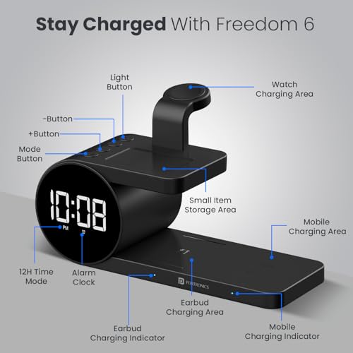 The Freedom 6 is a 5-in-1 wireless charger that simultaneously powers up to 3 devices—smartphones, smartwatches, and earbuds—with different wattages for each. It features a night light and digital alarm clock, reducing clutter. With 15W fast charging and Type-C input compatibility, it works with iPhone, Apple Watch, AirPods, and other Qi-enabled devices. Compact and lightweight, it’s ideal for home, office, or travel.