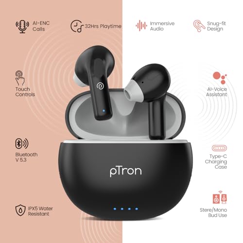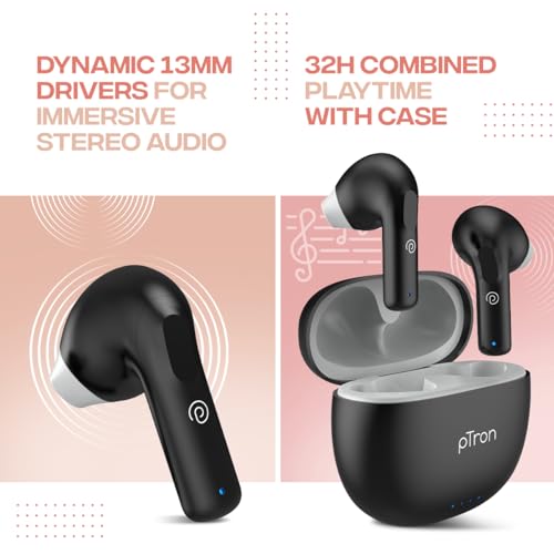 pTron Bassbuds NX in-Ear TWS Earbuds w/Dual HD Mic & AI-ENC Clear Calls, 32Hrs Playtime, 13mm Drivers, Bluetooth 5.3 Wireless Headphones, Voice Assistant, Type-C Fast Charging & IPX5 (Coal Black)