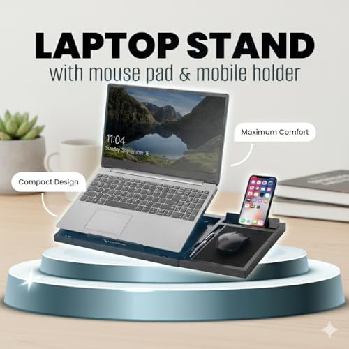Home TECHBOOTH Ergonomic Laptop Stand for Desk with Detachable Mouse Pad & Phone Holder, Multi-Angle Riser, Compatible with MacBook, HP, Dell, Lenovo Laptops (Up to 18 inch), Black