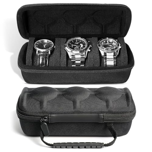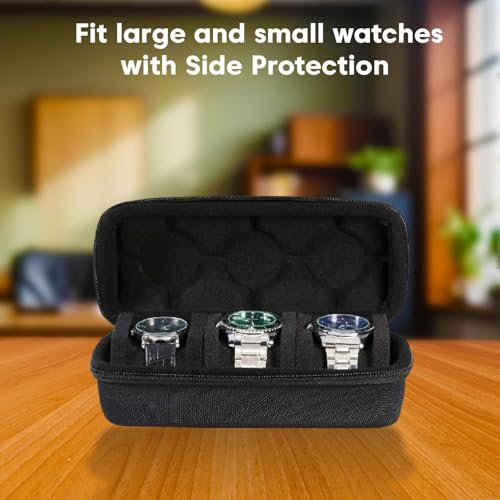 This 2 & 3 slot watch box fits any men’s or women’s watch, including smartwatches, fitness trackers, and luxury timepieces with a face size under 60mm. It accommodates all brands and styles, making it a versatile storage option. This case not only stores your watch but also holds accessories and jewelry. With a carabiner for easy attachment to bags, it’s perfect for travel, biking, or home use. Its compact design makes it one of the best storage options for any occasion. Crafted with a crush-proof hard shell and a ballistic 1680 Denier Nylon exterior, this travel case ensures your wristwatch or smartwatch is well-protected. Whether they are traveling or storing, it’s designed to withstand impact and safeguard your timepiece effectively.