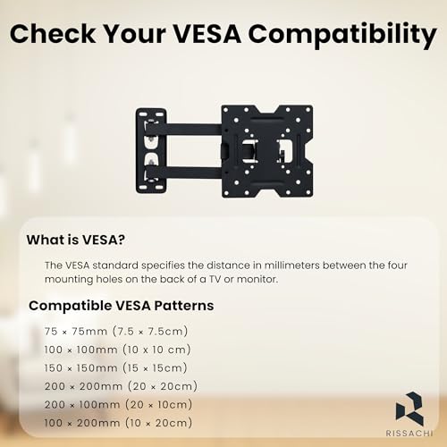 VESA Compatibility : 75 x 75 mm (7.5 cm x 7.5 cm), 100 x 100 mm (10 cm x 10 cm) , 150 x 150 mm (15 cm x 15 cm) , 200 x 100 mm (20 cm x 10 cm), 200 x 200 mm (20 cm x 20 cm), 300 x 300 mm (30 cm x 30 cm).